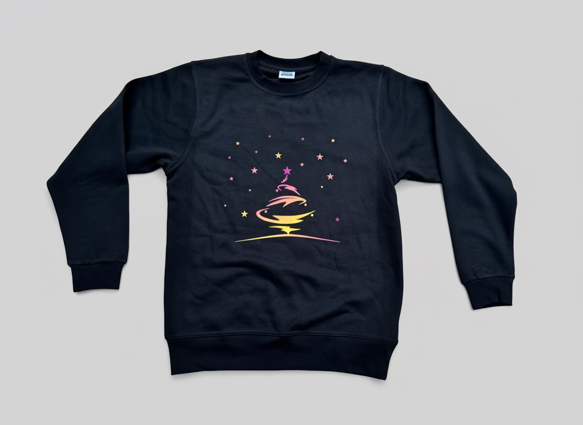 Sweater, hoody of T-shirt met een magic christmas tree print. Verkrijgbaar in verschillende kleuren en maten.
